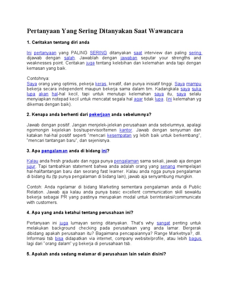 Salah satu persiapan terbaik adalah dengan memahami jenis dan tipe pertanyaan yang paling sering diajukan dalam wawancara. Dalam wawancara kerja ada beberapa pertanyaan umum yang biasa ditanyakan kepada calon pekerja untuk mengisi posisi yang diinginkan. 27 februari 2017.
