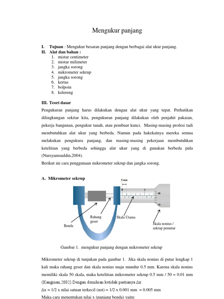 Cara Menghitung Jangka Sorong Pengertian Rumus Hitung (Josie Lyons) Contoh soal ini terdiri dari beberapa model soal tentang pengukuran yang umum seperti menentukan ketidakpastian pengukuran, ketelitian alat ukur, menentukan hasil pengukuran. Penggaris/mistar, jangka sorong, dan mikrometer sekrup merupakan contoh alat ukur panjang. Prinsip kerja mikrometer sekrup adalah memperbesar jarak yang terlalu.